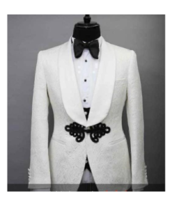 White wedding with black butterfly buttonxedo ——–Experience sophistication and timeless style with our impeccably tailored wedding suit.
